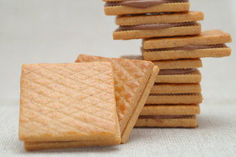焼成後、テンパリングしたミルクチョコをサンドする。