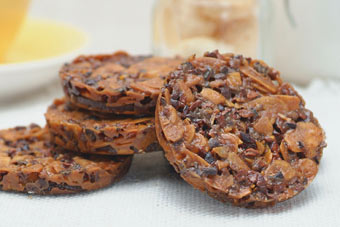 - 少しローストしたアーモンドスライスと、グリエドカカオを加え、軽く空焼きしたサブレにのせ、焼成。